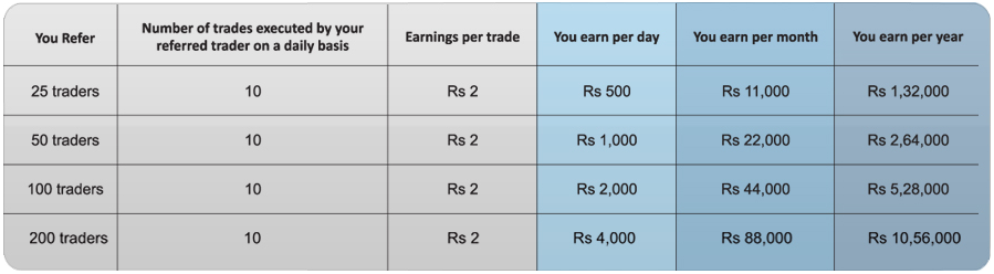 The table below illustrates how much you can potentially earn by becoming a Zerodha Associate.